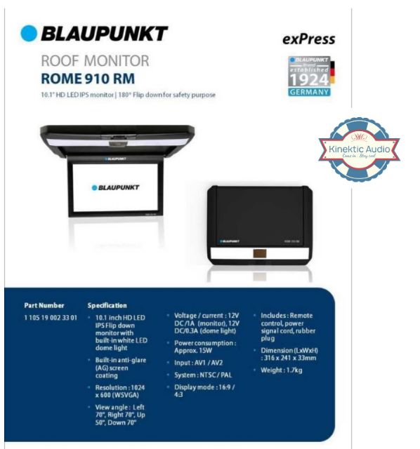 BLAUPUNKT ROME 910 RM – 10.1 OVERHEAD FLIP-DOWN LCD MONITOR BUILT-IN SPEAKER ROOF MONITOR